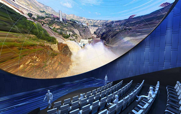 穹頂式球幕投影打破了以往投影圖像只能是平面規則圖形的局限,利用特殊的光學鏡頭,將普通的平面影像進行特殊的變換,投射到一個球形的屏幕內,形成一個內投的球體影像。